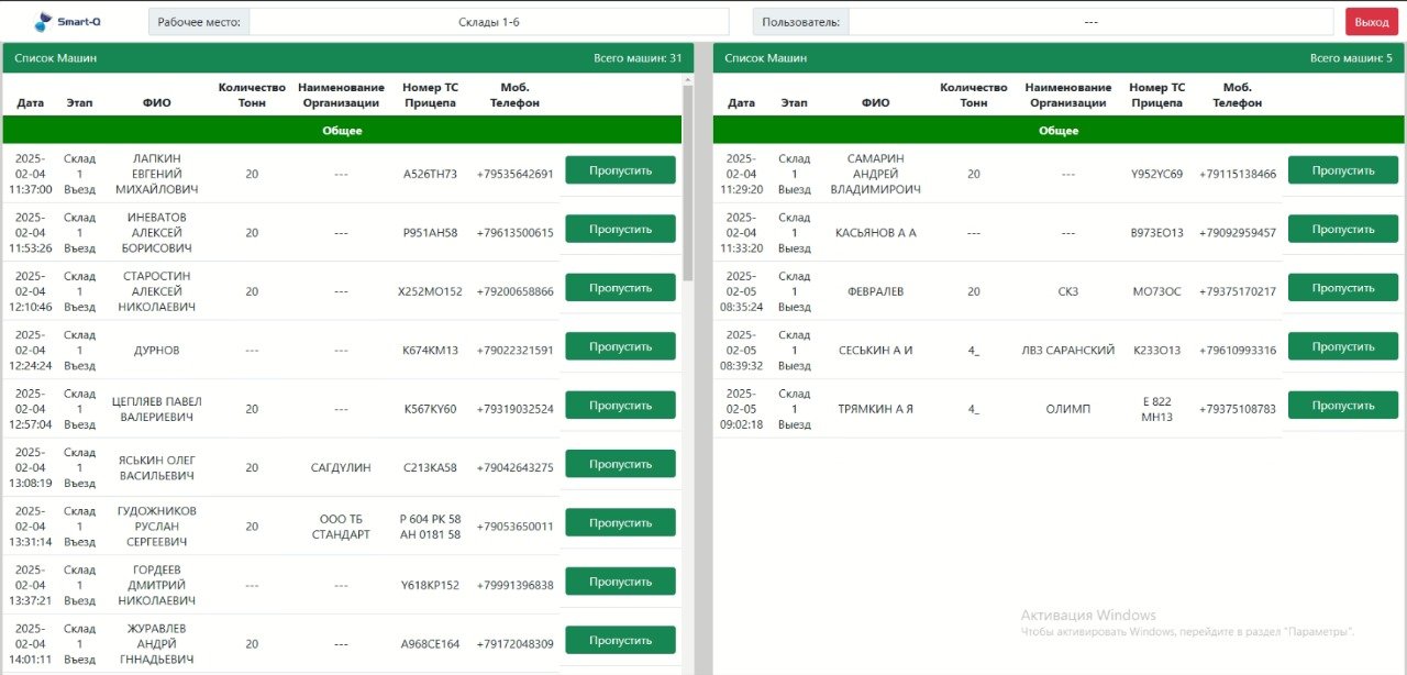 Одной из ключевых задач было введение системы электронной очереди для машин, прибывающих на погрузку и разгрузку. Все водители теперь регистрируют свое прибытие на специальном терминале, подтверждая свой номер телефона через получение SMS-сообщения. После этого они приглашаются на оформление документов, а кладовщики в своем интерфейсе вызывают машины на определенный склад и место для погрузки.