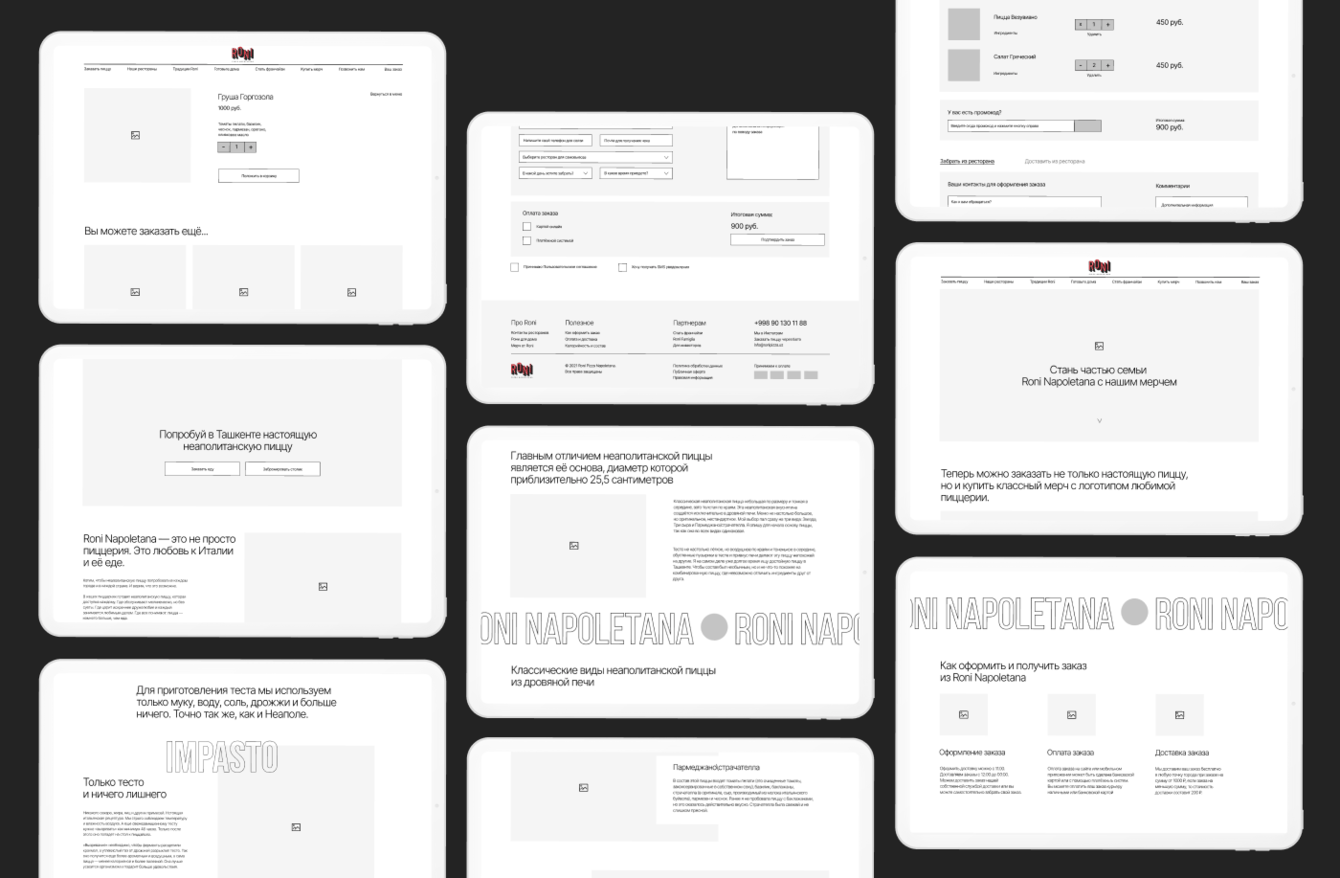 В итоге получилось 20+ уникальных страниц, включая 2 каталога — для заказа еды и классного мерча Roni.