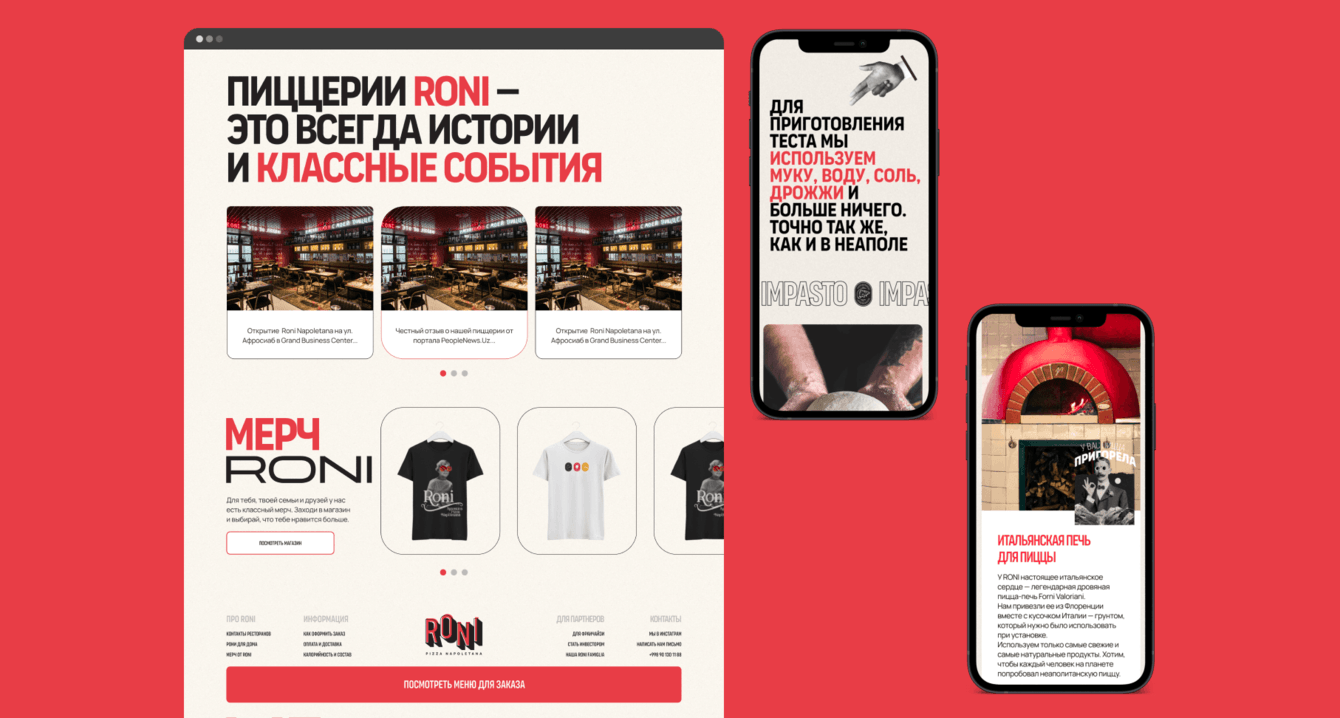 В итоге получилось 20+ уникальных страниц, включая 2 каталога — для заказа еды и классного мерча Roni.