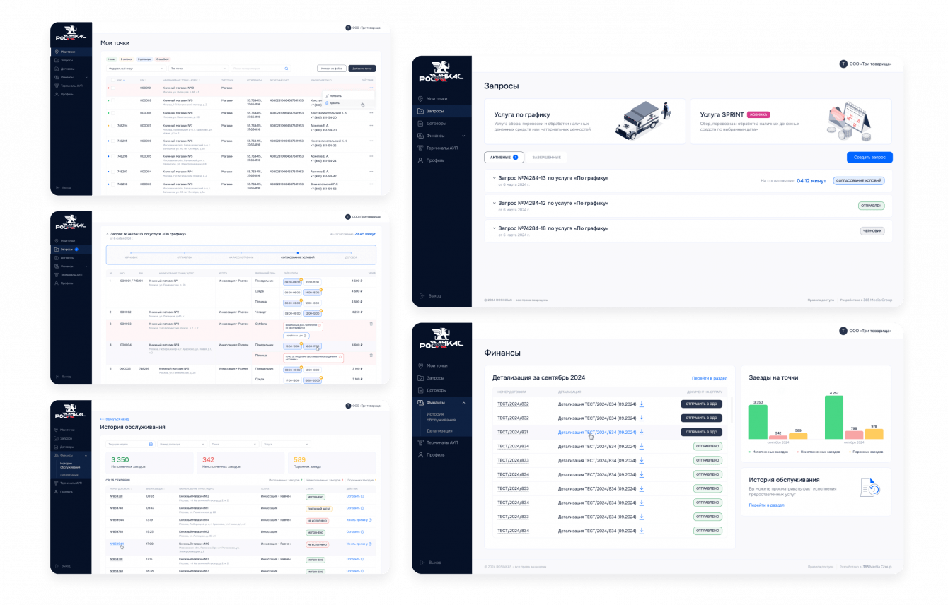 Первоначально был спроектирован личный кабинет с пошаговым методом создания запроса на обслуживание. Мы продумали, как основные этапы инкассации перенести в онлайн-формат. Составили флоу пользователя из самых важных шагов. На основе флоу сделали кликабельные прототипы, где заказчик мог самостоятельно пройти весь путь клиента. При отрисовке интерфейса опирались на анализ схожих сервисов и результаты бенчмаркинга.