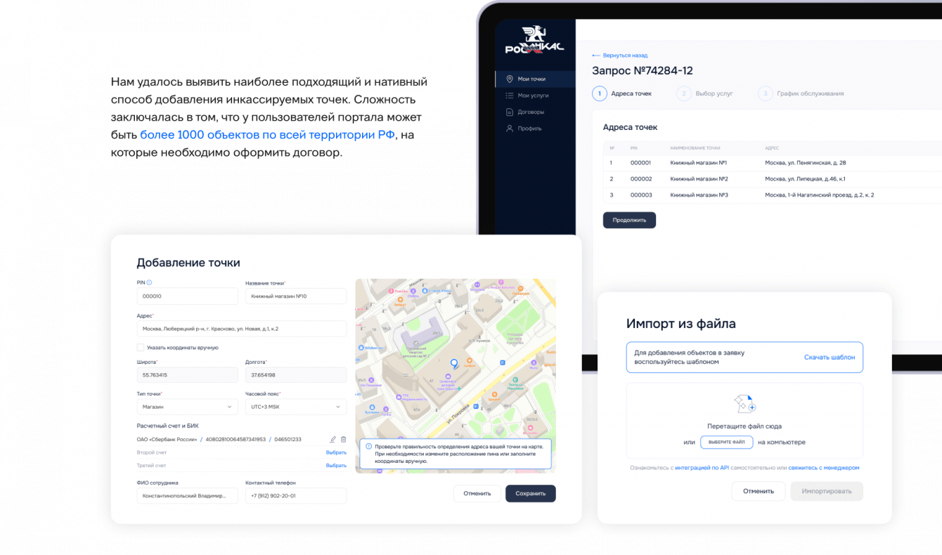 Основная цель платформы: обеспечить клиента возможностью оформить и получить действующий договор на обслуживание в минимальные сроки, полностью управлять точками инкассации и графиком обслуживания онлайн.