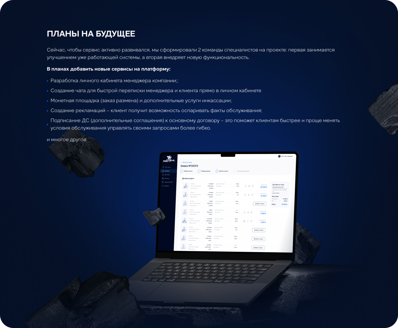 Основная цель платформы: обеспечить клиента возможностью оформить и получить действующий договор на обслуживание в минимальные сроки, полностью управлять точками инкассации и графиком обслуживания онлайн.