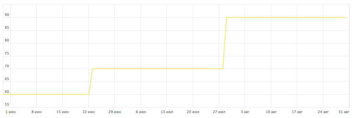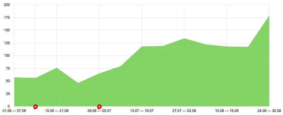 В следствии всех этих мер помимо результатов в выдаче, нам удалось добиться роста рейтинга сайта. Что видно по росту показателя ИКС.