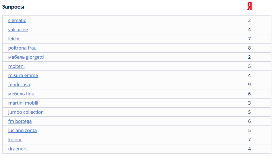Вывод целевых запросов брендов мебели компании на первые места поисковой выдачи. А также увеличение конверсии с сайта.