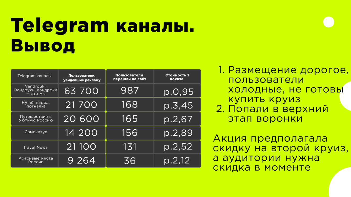 Несмотря на то, что по метрикам привлекли качественный трафик, низкий показатель отказов, хорошую глубину просмотра и время на сайте, а также только ассоциированные конверсии, размещение было дорогим, а пользователи холодные. Они не были готовы купить круиз. Мы попали в верхний этап воронки. Акция предполагала скидку на второй круиз, а аудитории нужна скидка в моменте.