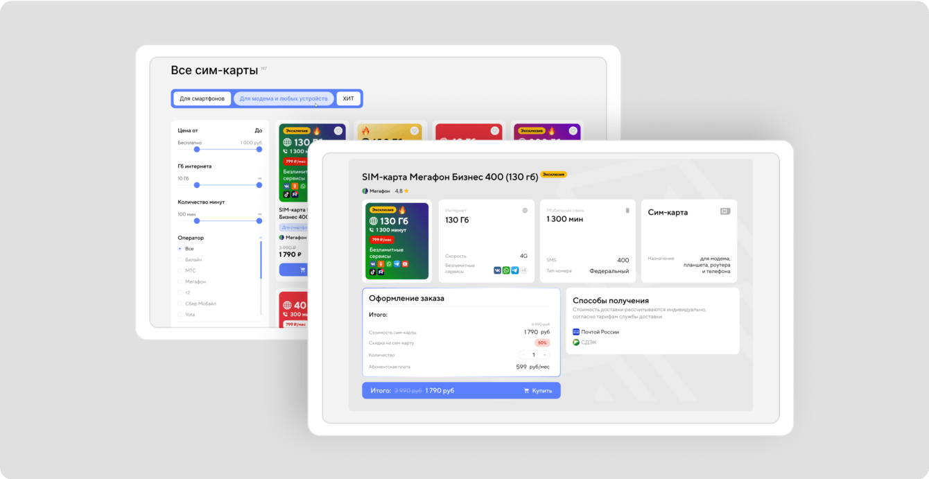 Карточка тарифа / SIM-карты: Добавлена кнопка “Заказать SIM-карту” с возможностью сразу оформить покупку в "1 клик", без обходных форм обратной связи.