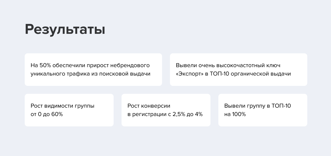 Несырьевой экспорт — специфичная тематика для SEO-оптимизации, так как за ТОП в поисковой выдаче приходилось соперничать с большими агрегаторами и информационными порталами.