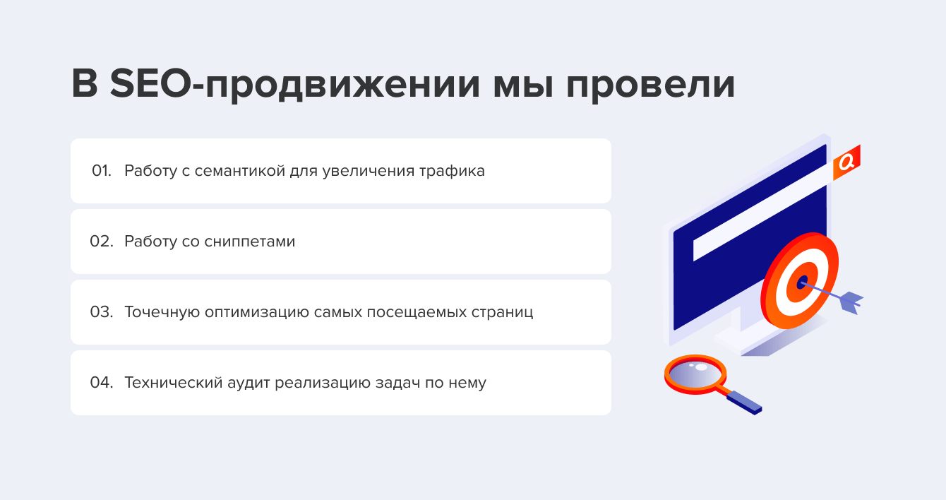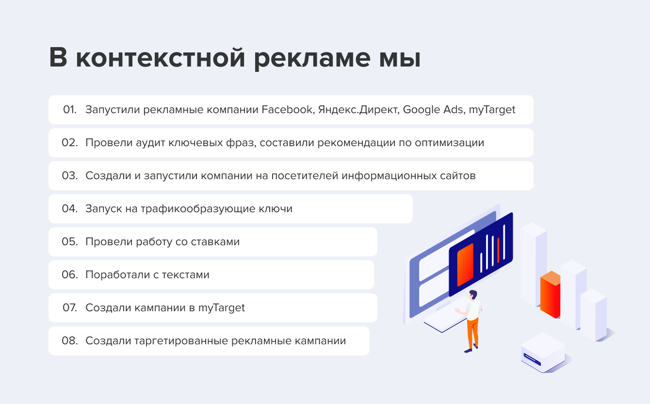 Чтобы решить поставленные клиентом задачи, нам нужно было выполнить работы по контекстной рекламе и SEO.
