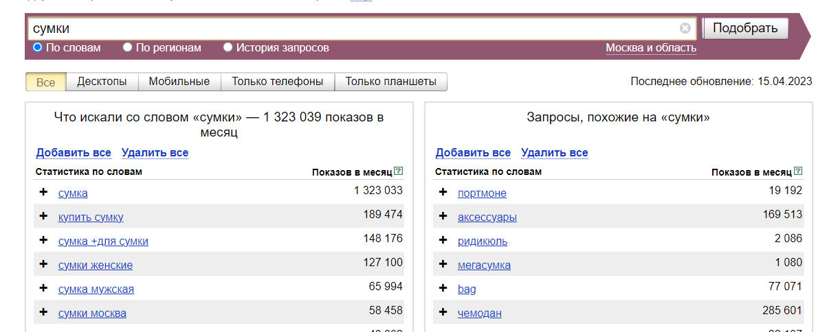 1 Определить самый главный ключевой запрос. Здесь поможет сервис Яндекса Wordstat. Выбрав нужный регион и указав различные запросы, задающие тематику выбираем самый жирный по спросу. Главное выбрать коммерческий, ведь мы продаем сумки. (удостовериться в типе запроса можно просто - открыть вкладку браузера в режиме инкогнито и в яндексе вбивать запрос. Если большая часть сайтов - коммерческие магазины и т.д., запрос нужны. Главное — выбрать коммерческий, ведь мы работаем с интернет-магазином, в конкретном случае — продающим сумки (проверить тип запроса просто: нужно открыть вкладку браузера в режиме “Инкогнито” и вбить в Яндексе запрос. Если большая часть сайтов — коммерческие магазины и т.д., запрос нужный).