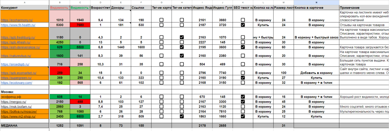 если допустить ошибку на данном шаге, можно сделать неправильные пропорции и сделать негативный эффект для сайта, нежели позитивный. Поэтому важно отобрать именно схожих по типу сайта конкурентов, исключая другие типы. То есть - если у вас интерент-магазин, нужно исключать агрегаторы, маркетплейсы.