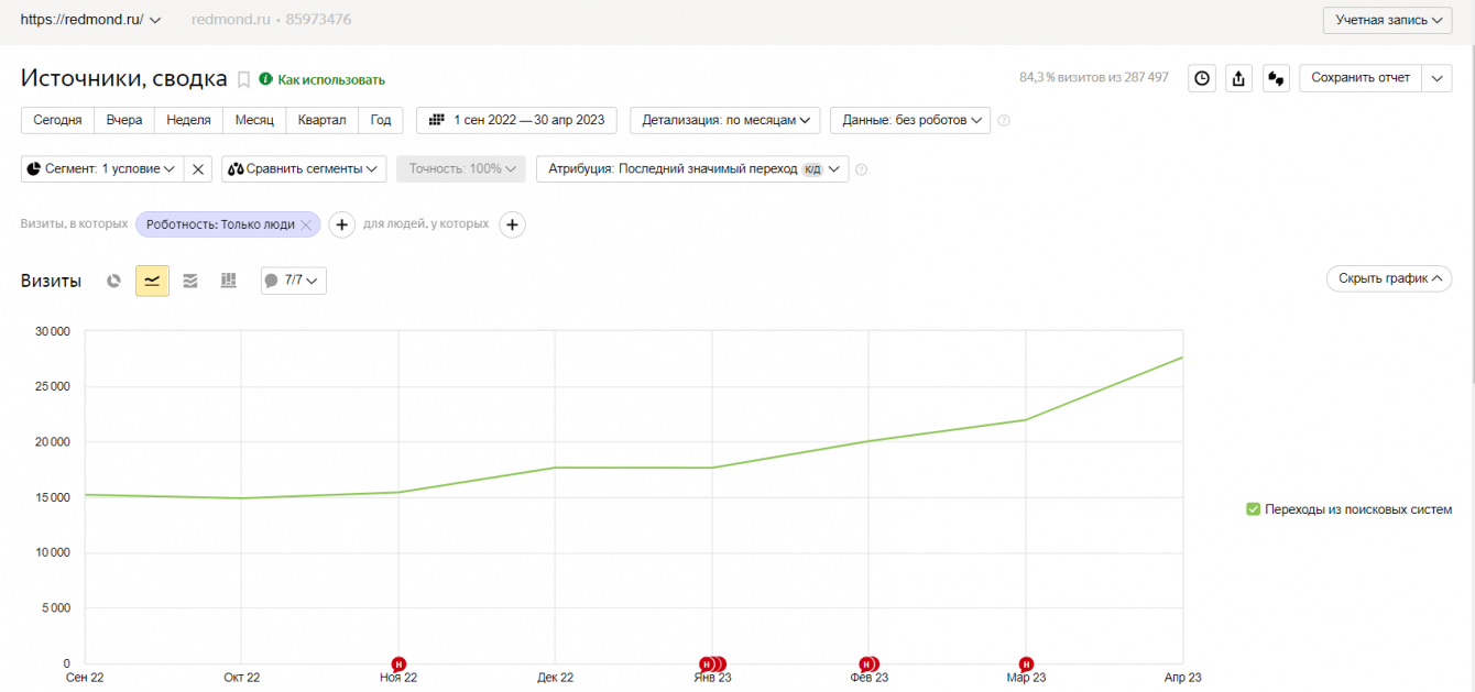 Всё началось с качественной разработки веб-сайта Redmond.ru, который был выполнен на высоком уровне и обговоренные сроки! Услугами компании Артема мы продолжаем и дальше активно пользоваться. Благодаря нашим совместным усилиям и профессиональному подходу к работе, наш совместный проект - продвижение сайта Redmond в ТОП, показывает отличные результаты. А за последние 6 месяцев SEO-продвижения нашего сайта и продвижения в Яндекс.Директ мы успешно выходим на оборот розничного интернет-магазина в 1 млн. рублей к концу апреля 2023 года.