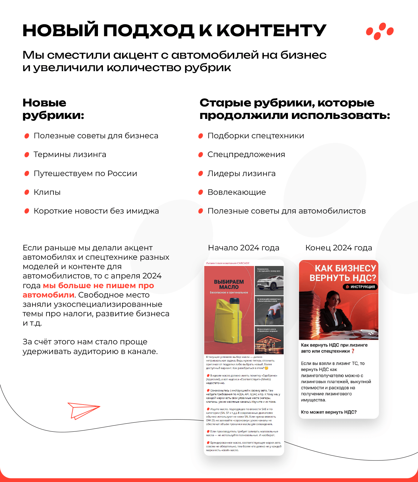 Лизинг - ниша с коротким жизненным циклом интереса: сразу после заключения сделки внимание аудитории снижается. К началу 2024 года мы зафиксировали рост оттока подписчиков.