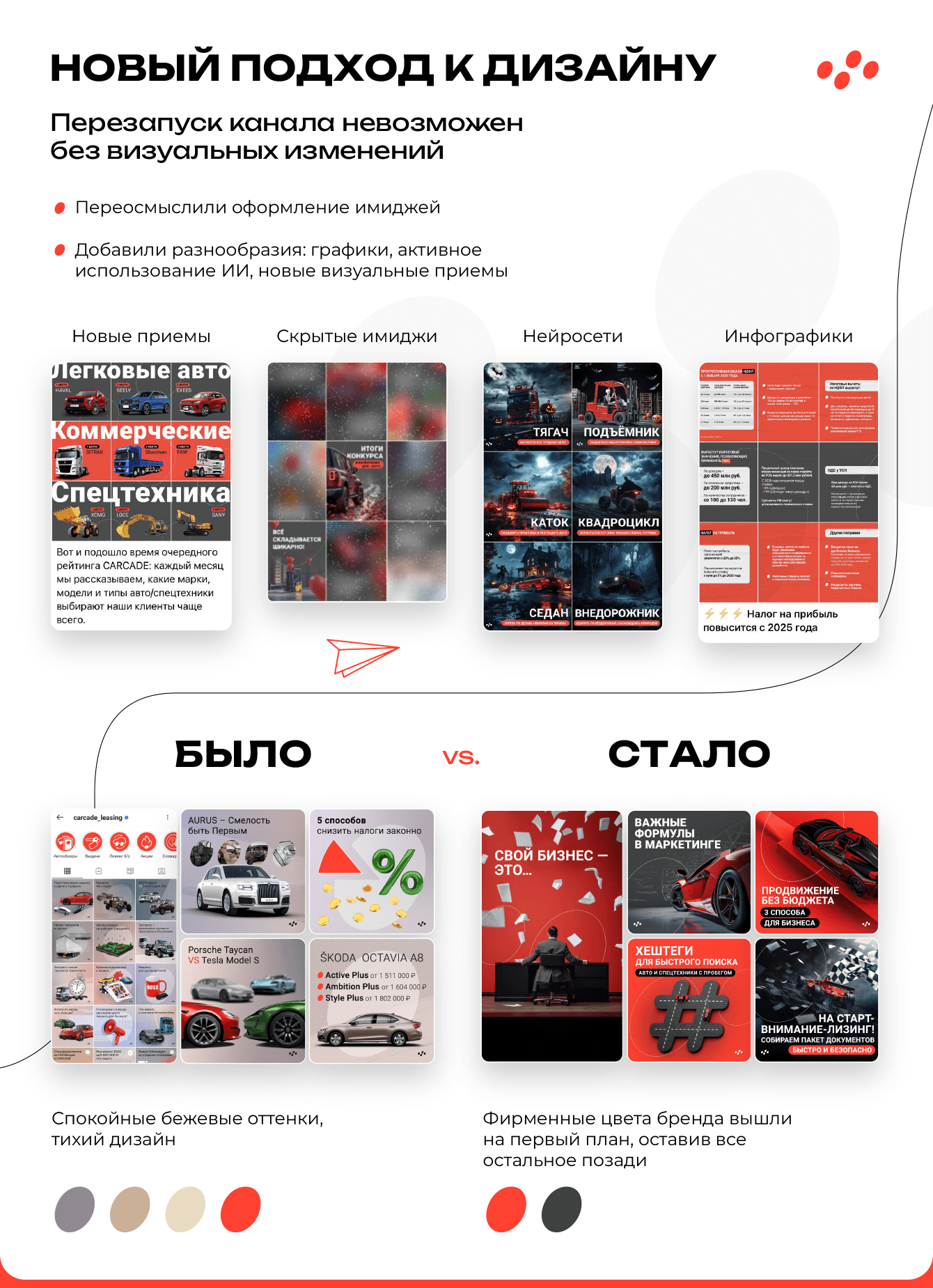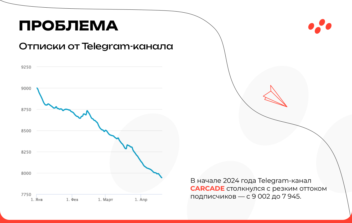 CARCADE - федеральная лизинговая компания, предоставляющая услуги по легковому, коммерческому, грузовому транспорту и спецтехнике. С 2022 года бренд занимает первое место по числу подписчиков в Telegram среди конкурентов, и важно удерживать эту позицию.