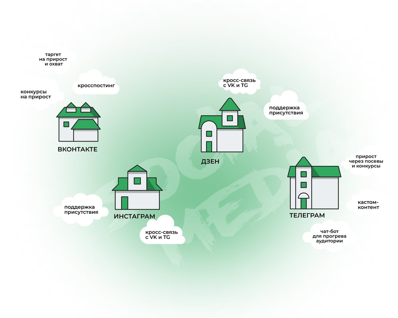 У клиента уже были заведены страницы в 4 соцсетях: ВКонтакте, Телеграм, Дзен и Инстаграм* (*Относится к Meta и запрещен в РФ).