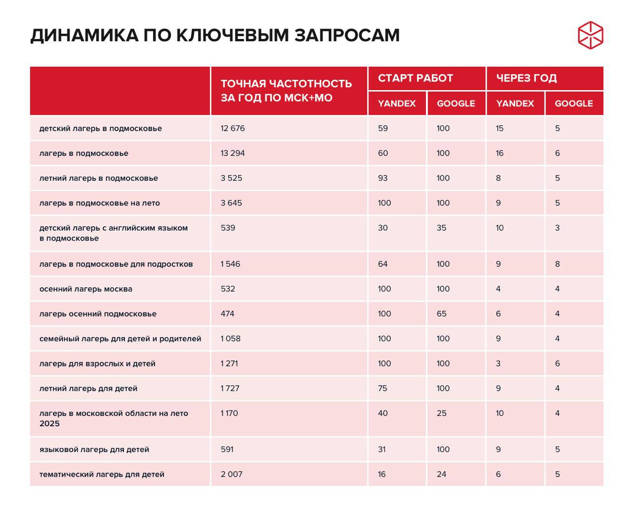 Мы собрали максимально полное семантическое ядро для проекта: 910 коммерческих запросов и ещё 415 информационных. Чтобы расширить охват и привлечь дополнительный трафик, подготовили около 30 новых страниц под конкретные сезонные направления лагерей. Для карточек заездов проработали и внедрили около 300 мета-данных.