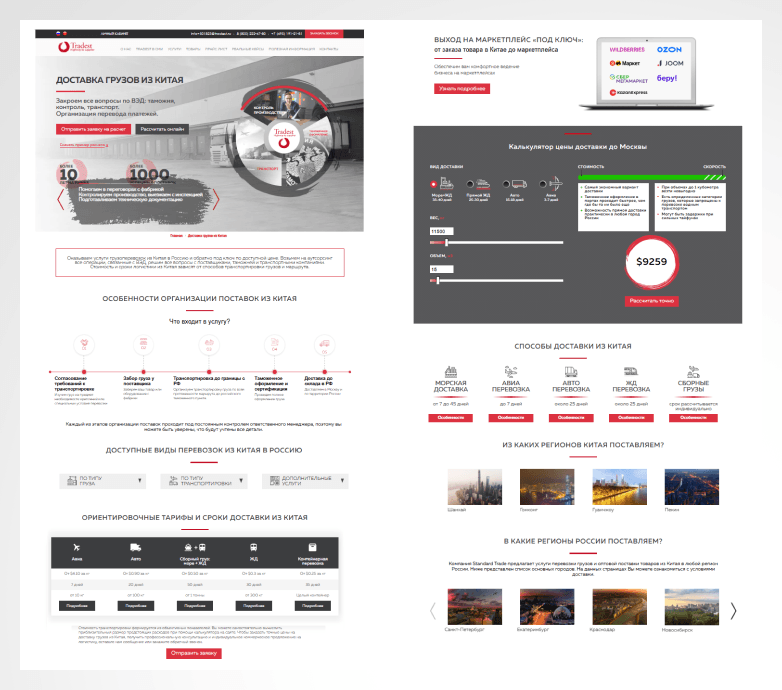 Для повышения доверия добавили отзывы клиентов, упоминания в СМИ, блоки с заслугами и краткую информацию о компании. Для удобства пользователей — калькулятор доставки, быстрые кнопки перехода к заявке и карту расположения офиса.