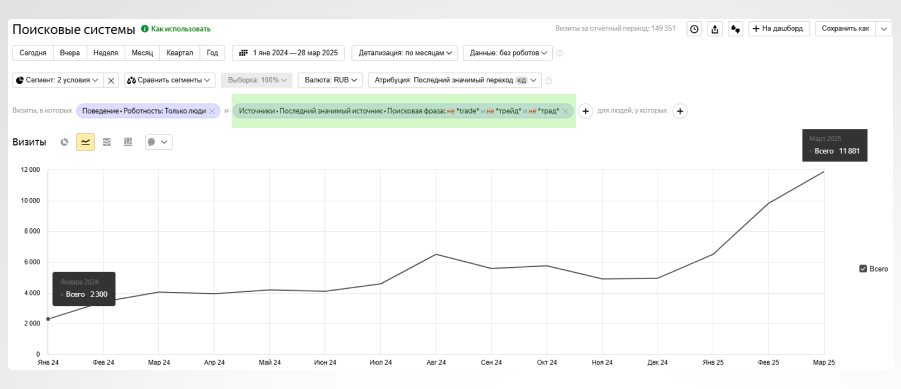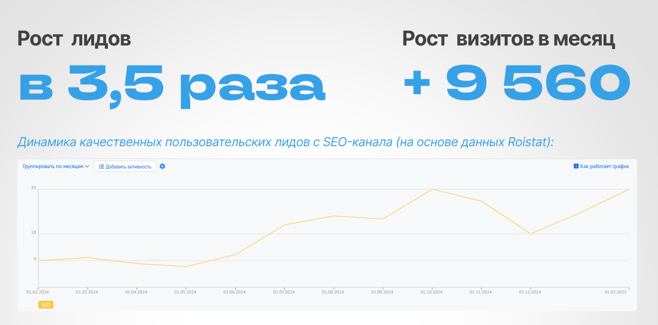 +9 560 визитов ежемесячно из поиска (небрендовый трафик вырос в 5 раз);