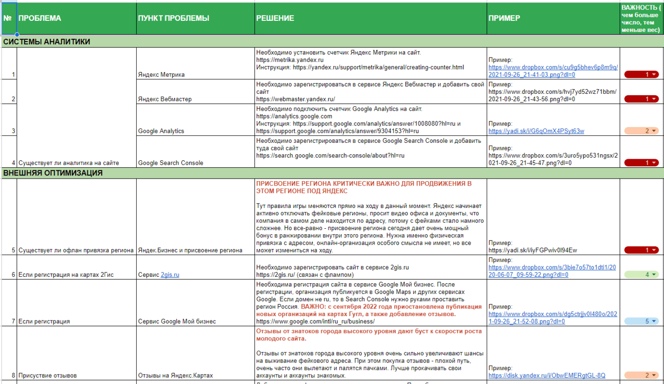 Это некоторые из пунктов что были выданы клиенту для устранения. Задача стояла, чтобы он уже начал вносить корректировки на сайт, чтобы шла работа и уже пошли первые движения проекта.