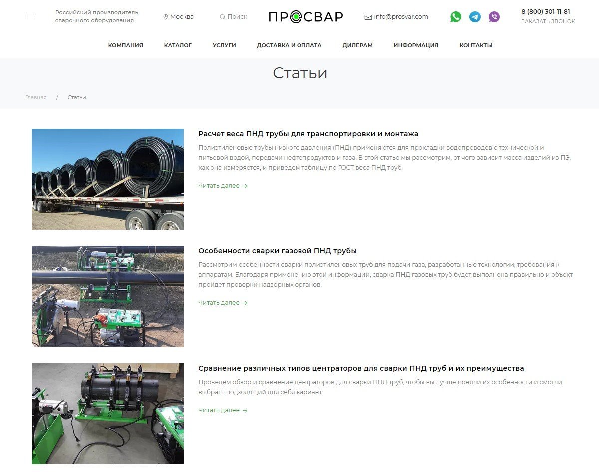 Клиент: «Просвар» — производитель сварочных аппаратов для ПНД труб. Компания находится в Москве и поставляет свое оборудование по всей России.