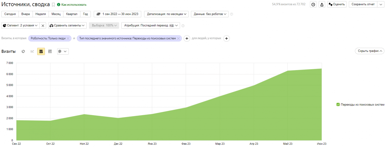 Компания обратилась к нам, имея такие показатели: 1930 переходов из поисковых систем в месяц. Менее чем за год продвижения трафик из поиска вырос до 6499 переходов.