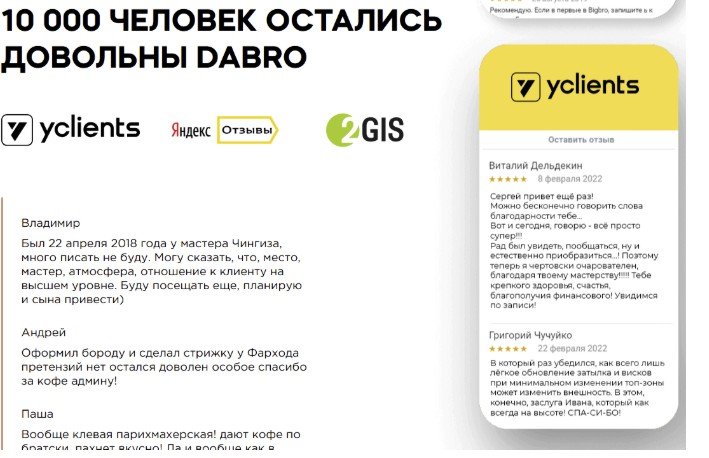 Владелец сети барбершопов DABRO выказал свои благодарности в видео https://www.youtube.com/watch?v=plnGxAJFtjI. Сотрудничеством полностью доволен и рад ежемесячному улучшению поискового трафика. Готов рекомендовать нашу компанию в качестве компетентного партнера по SEO продвижению.