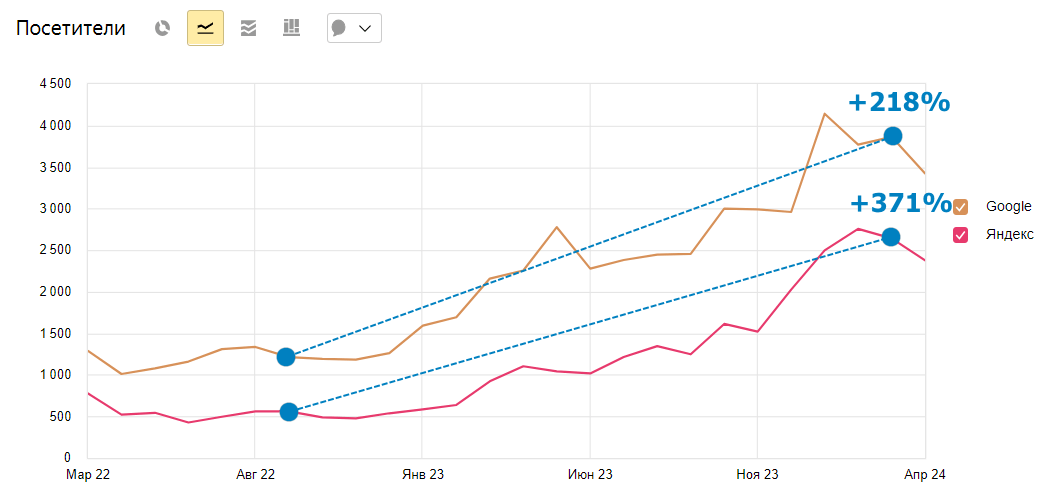Посетители с разбивкой по поисковым системам: Google: +218%, Яндекс: +371%.