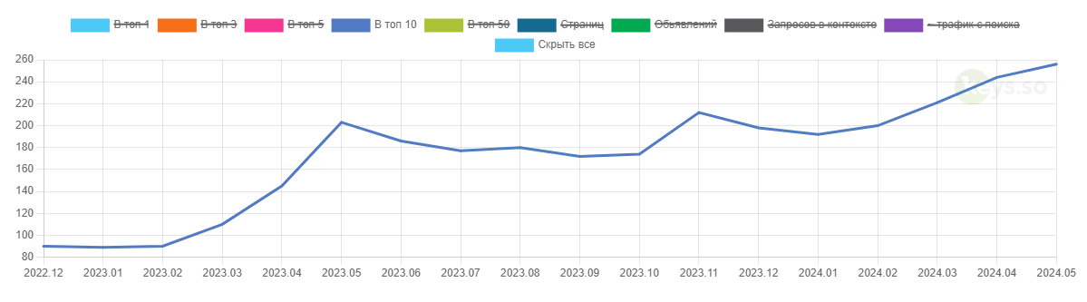 Количества ключей в Топ-10 Яндекса по данным key.so выросло на 180% за доступный период (не считая мая 2024):