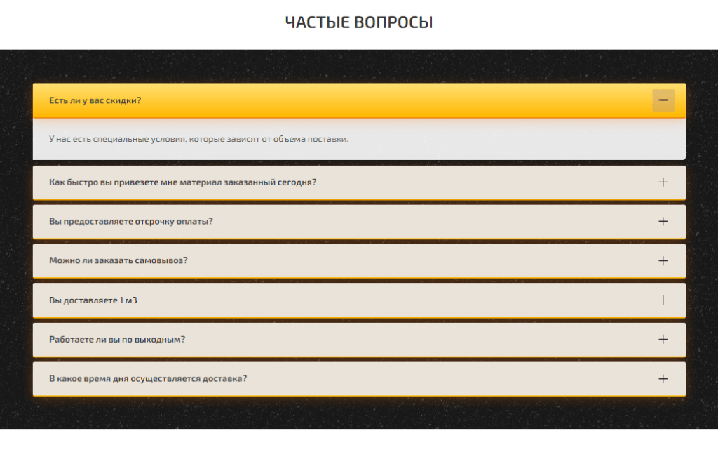 Мы собрали реальные вопросы, которые менеджеры получают от клиентов, и оформили их в раздел FAQ. Теперь посетители сразу находят ответы на типичные запросы: