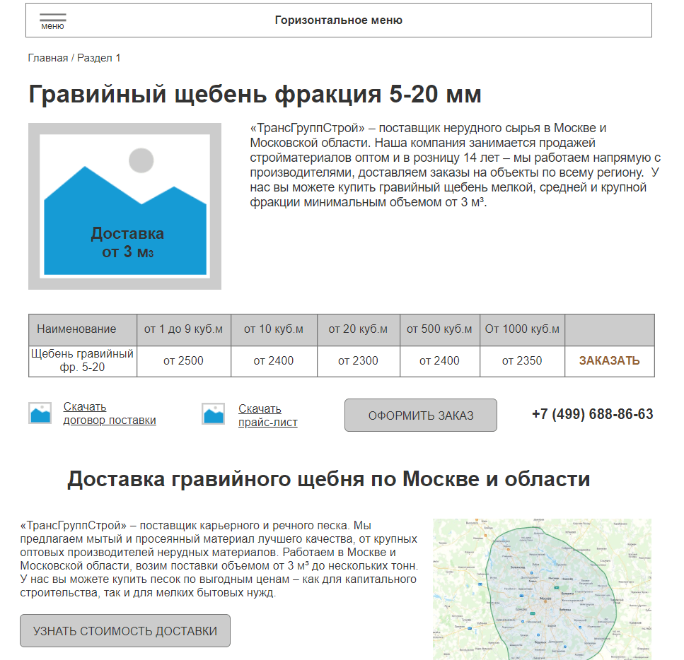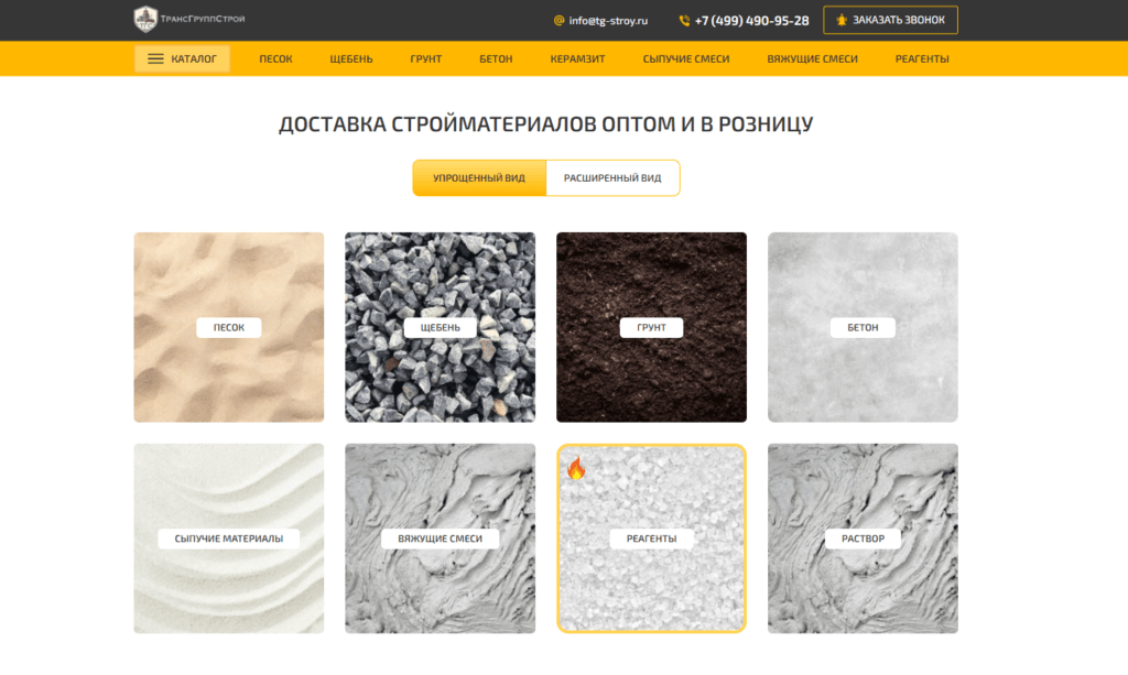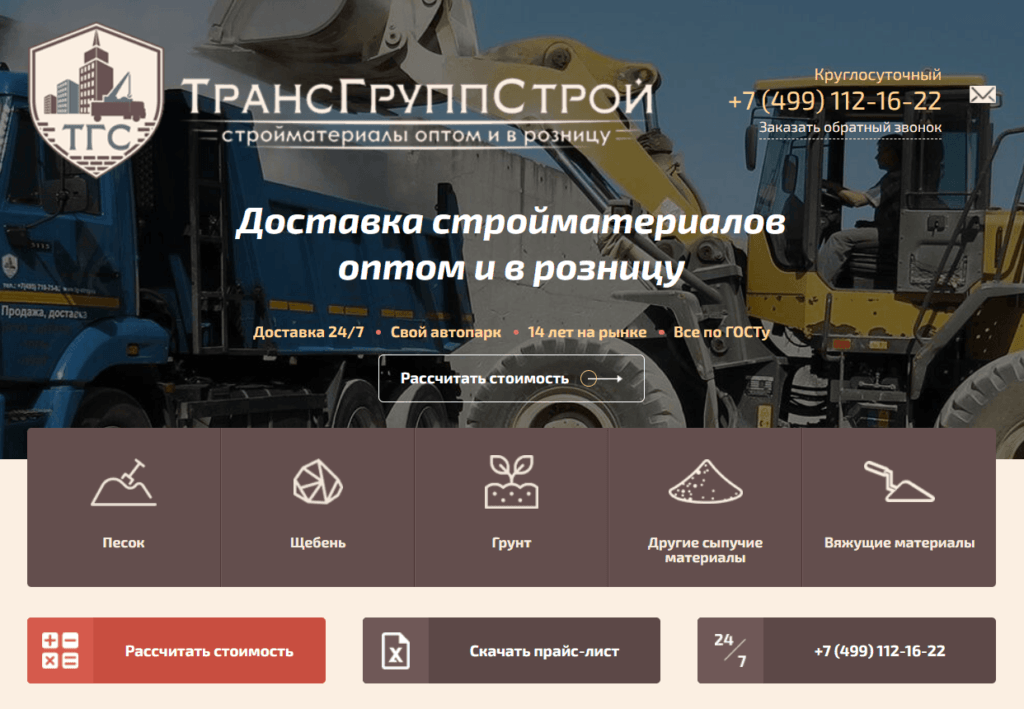 Компания «ТрансГруппСтрой» уже много лет занимается поставкой нерудных строительных материалов с доставкой по Москве и области. Конкуренция в этой нише — одна из самых жестких на рынке. Чтобы уверенно удерживать позиции и постоянно привлекать новых клиентов, нужен не просто сайт-визитка, а полноценный инструмент продаж.