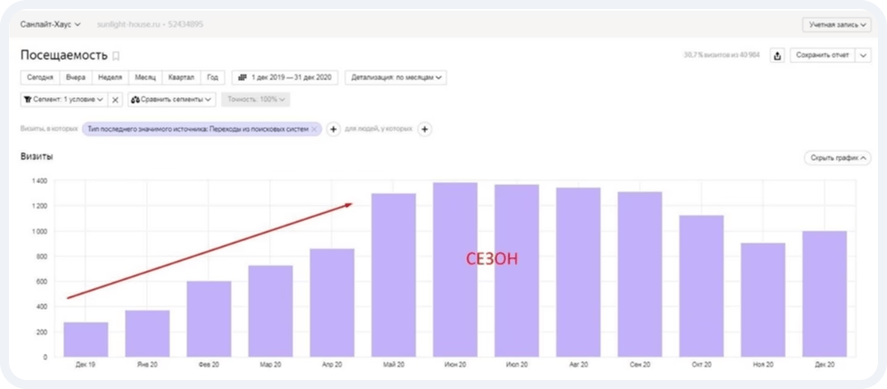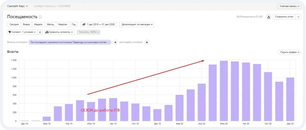Одна из особенностей строительной отрасли - это сезонность, а также нежелание вкладываться в рекламу и продвижение во время низкого спроса. Результаты данного проекта очевидно доказывают обратное: планомерное повышение трафика в течение всего года.