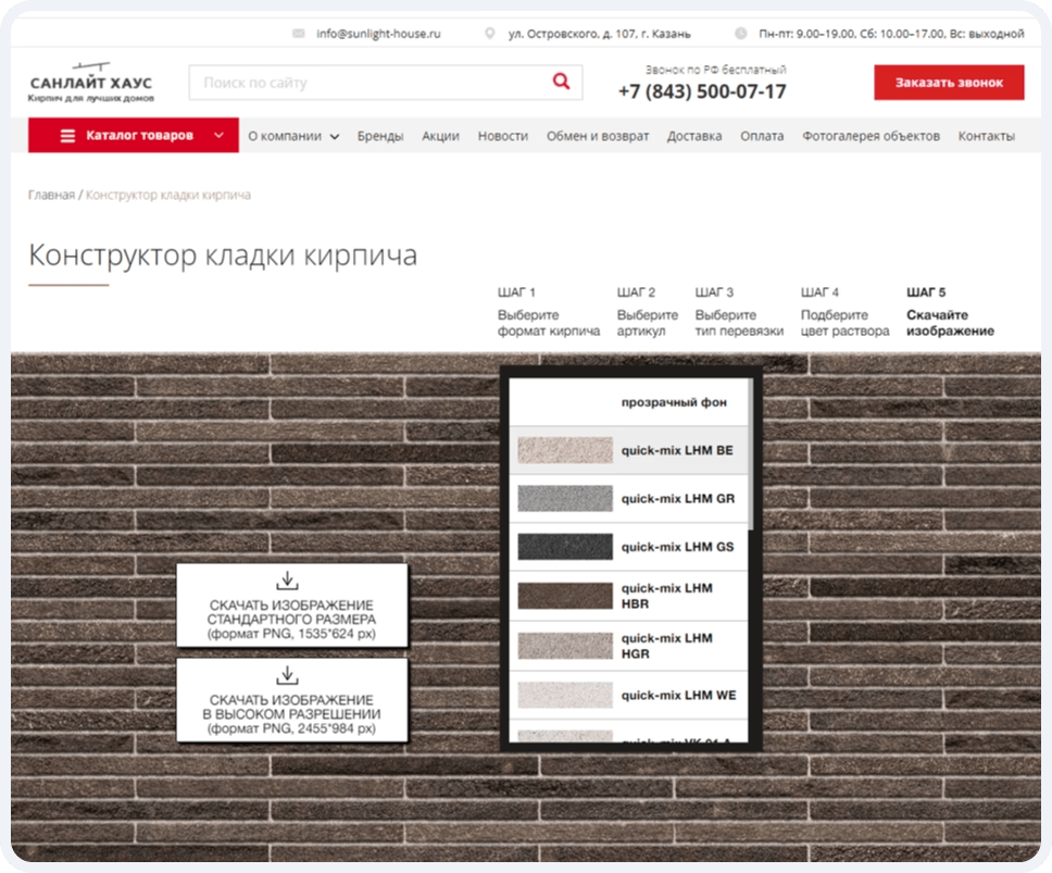 Одно из последних нововведений - конструктор кладки кирпича, в который можно перейти из каталога товаров. Этот удобный инструмент позволяет наиболее удачно подобрать материалы друг к другу и сделать правильный выбор.