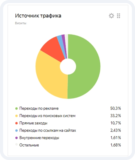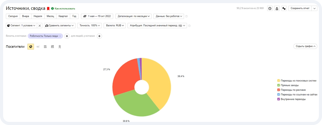 Глядя на сводку источников трафика, можно понять, что львиная доля посетителей приходит из поисковых систем и переходит по рекламе. Это является доказательством правильной SEO-оптимизации и грамотной настройки контекстной рекламной кампании.