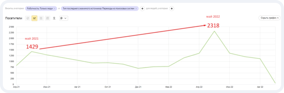 Стоит отметить, что в 2022 году трафик из поисковых систем почти достигал рекордных для компании 2,5 тысяч пользователей в пик сезона по сравнению с пиковым маем 2021 года!