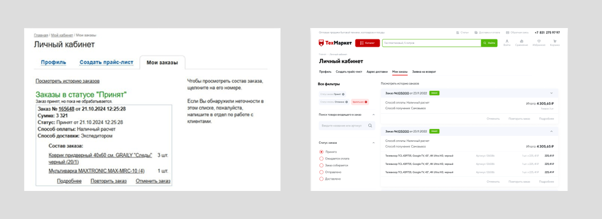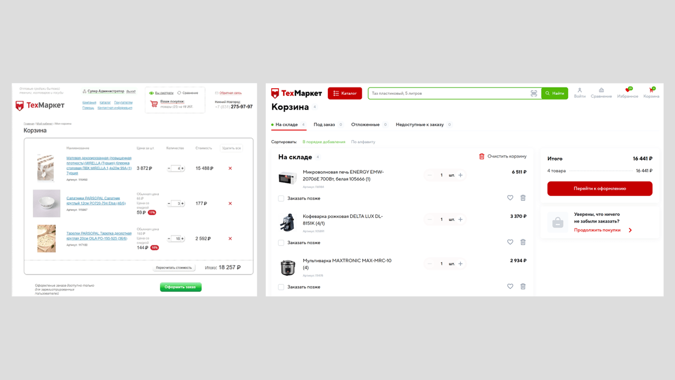 Функционал корзины до и после модернизации сайта
