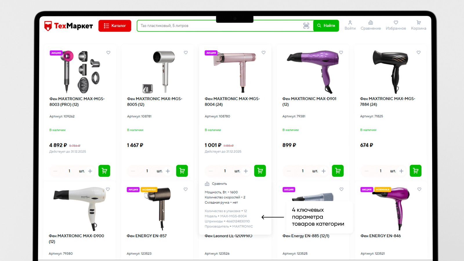 Чем меньше действий, тем лучше результат. Именно поэтому для сайта и его мобильной версии обязательными стали всплывающие поля с контекстными характеристиками. При наведении курсора на товар показываются 4 основных свойства, что помогает быстро просмотреть нужную информацию без открытия отдельной карточки. Например, при наведении на чайник показываются «Объём», «Материал», «Мощность», «Тип нагревательного элемента» — этого достаточно для принятия решения.