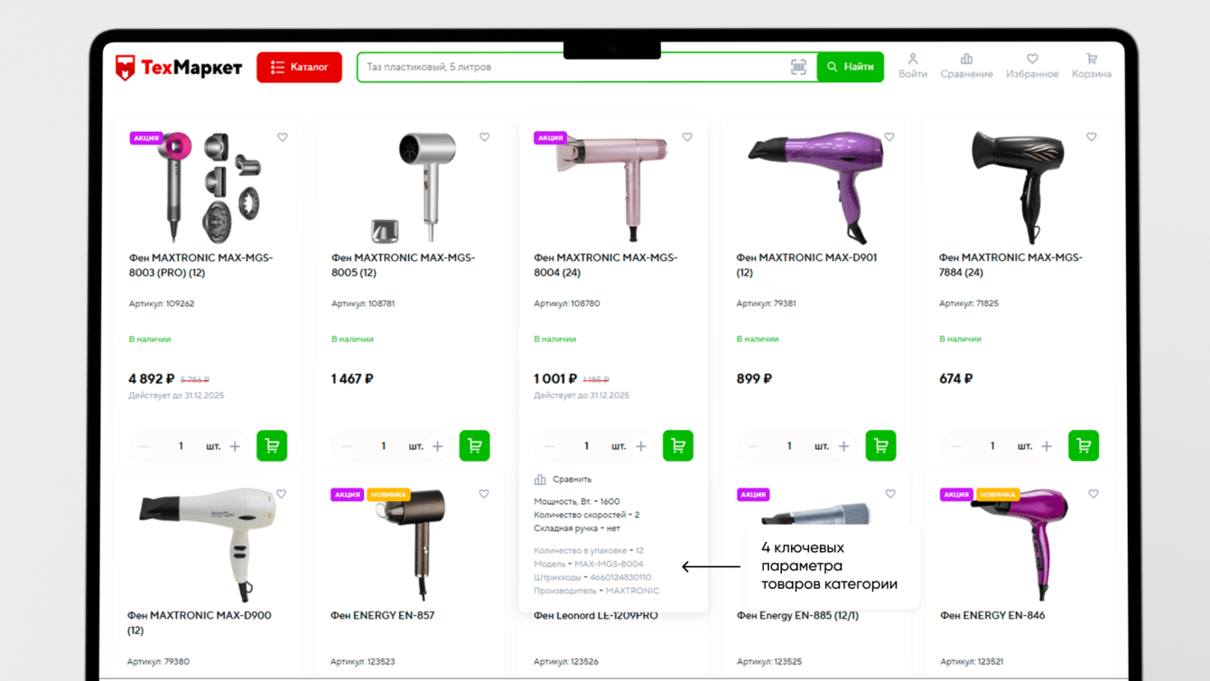 Новая архитектура позволила работать с более чем 3100 техническими свойствами — от размера до цвета и мощности — при сохранении производительности.