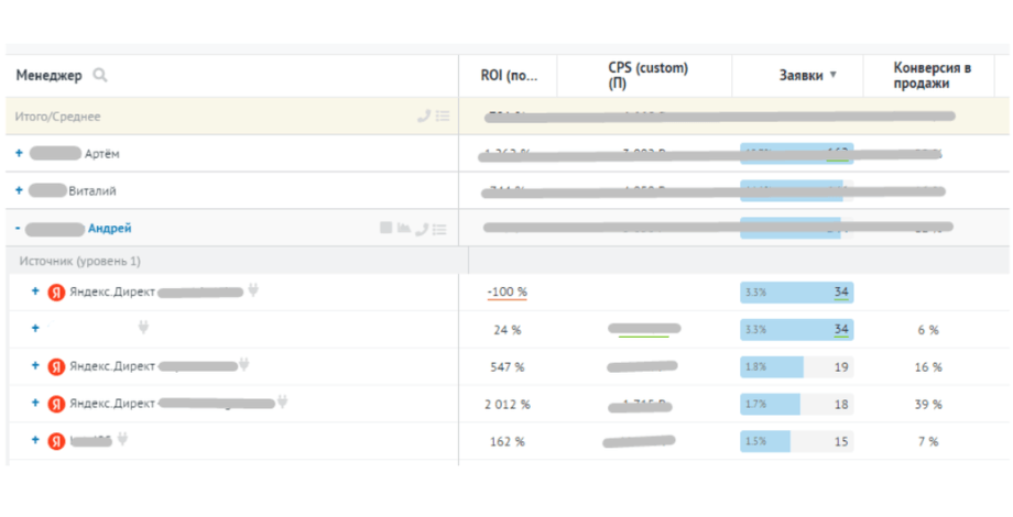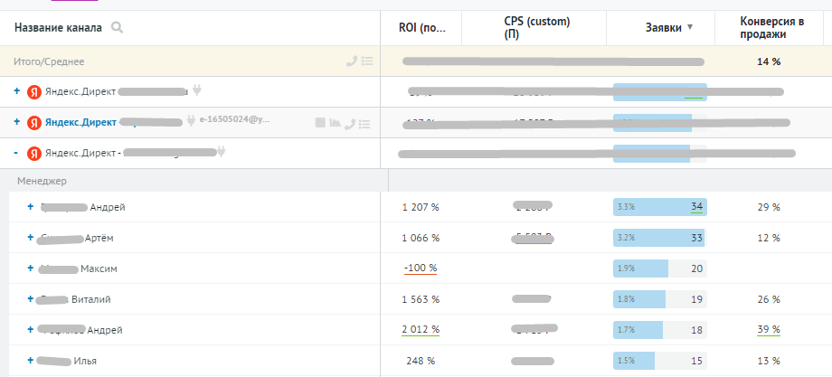 По итогу очередного анализа всех метрик под “раздачу” попал и отдел продаж. Мы не остановились только на анализе рекламных кампаний, но копнули и дальше - а кто и как обрабатывает лиды. И наткнулись на интересную картину - кто-то из менеджеров очень хорошо справлялся с лидами из контекста, а вот с лидами из таргета плохо, а кто-то наоборот. Или же с одной посадочной страницы кто-то закрывал лиды, а кто-то не мог.