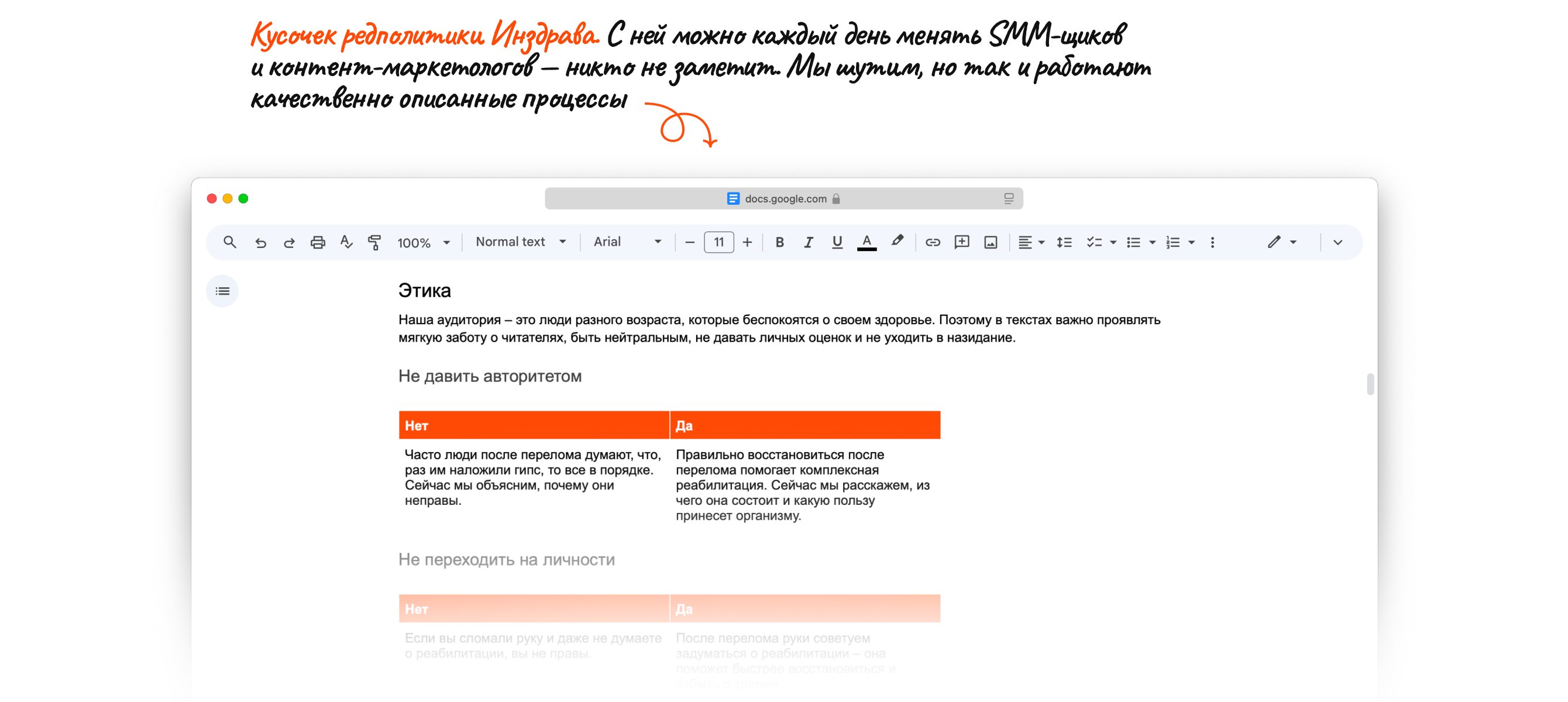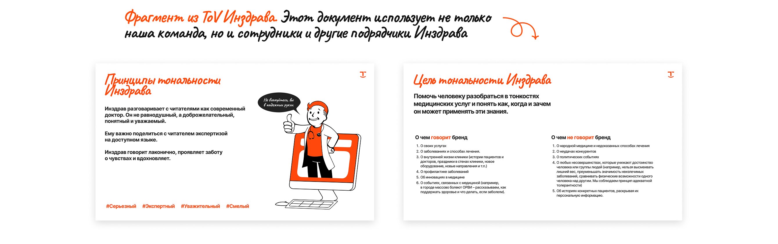 Зафиксировали подход в двух документах — Tone of Voice и редполитике. В первом прописали, на какие темы и в какой тональности Инздрав общается с аудиторией. А во втором — дали подробную инструкцию с примерами: прописали, какие слова используем, а какие нет, пишем «е» или «ё» и так далее.