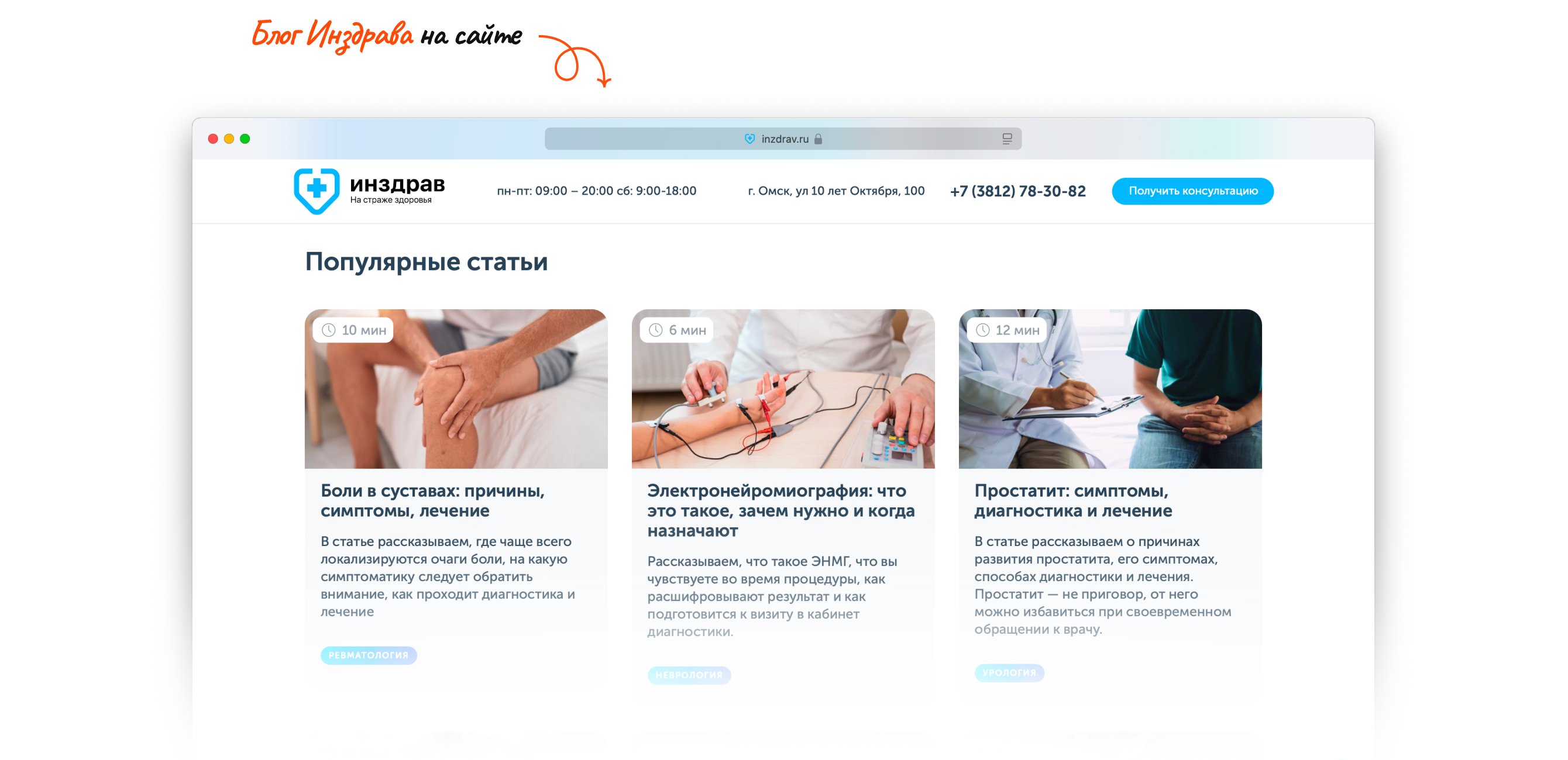 Мы запустили блог на сайте Инздрава с полезными SEO-статьями. Параллельно выпускаем статьи на промо-страницах: это показывает неплохие охваты, но вау-результатов пока нет: нужно больше ресурсов на создание контента. Пока канал не настолько жирный и приоритетный, чтобы уделять ему много времени, но это есть в планах.