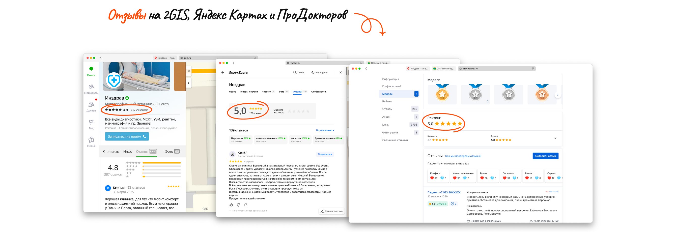 Чтобы этот пациент обратился в клинику, нужно закрыть его возражения уже на этом этапе — в оформлении карточки. Там много инструментов, к примеру, реальные отзывы пациентов и красиво оформленные карточки, для которых приходится заказывать дорогую профессиональную фотосессию.