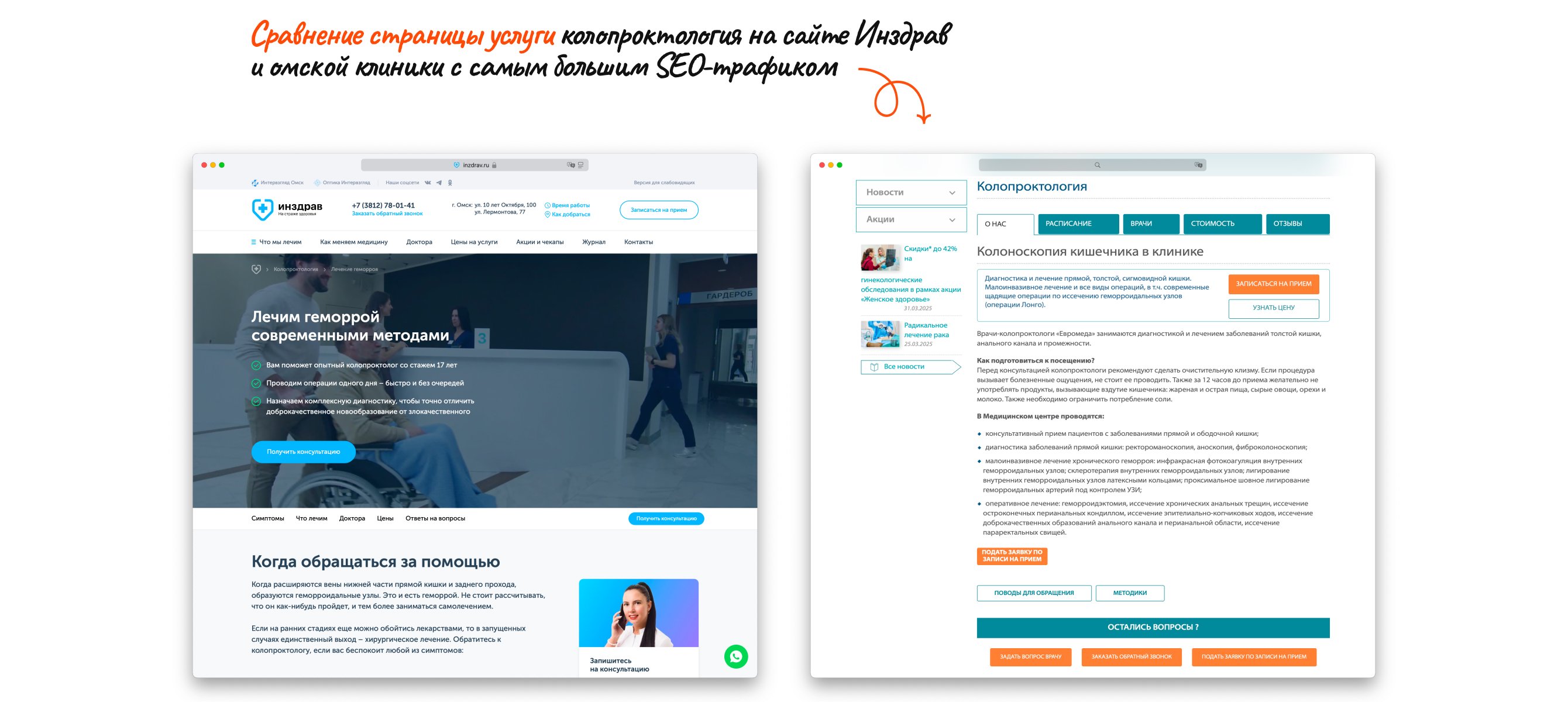 Заходим на сайт омской клиники с самым большим SEO-трафиком → Услуги → пусть будет Колопроктология — направление, которое есть и в Инздраве. Вроде бы ничего необычного, просто описание услуги. А теперь то же самое в Инздраве.