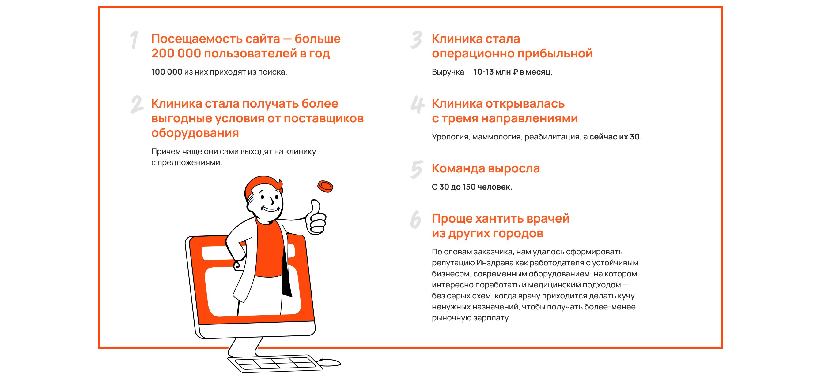 Это дорогая имиджевая история, которая отчасти сформировала вокруг Инздрава вайб крупной клиники, которая давно крепко стоит на ногах и не собирается уходить с рынка. Заказчик рассказывал, что такой имидж помог ему привлекать новых партнеров и поставщиков с выгодными предложениями.
