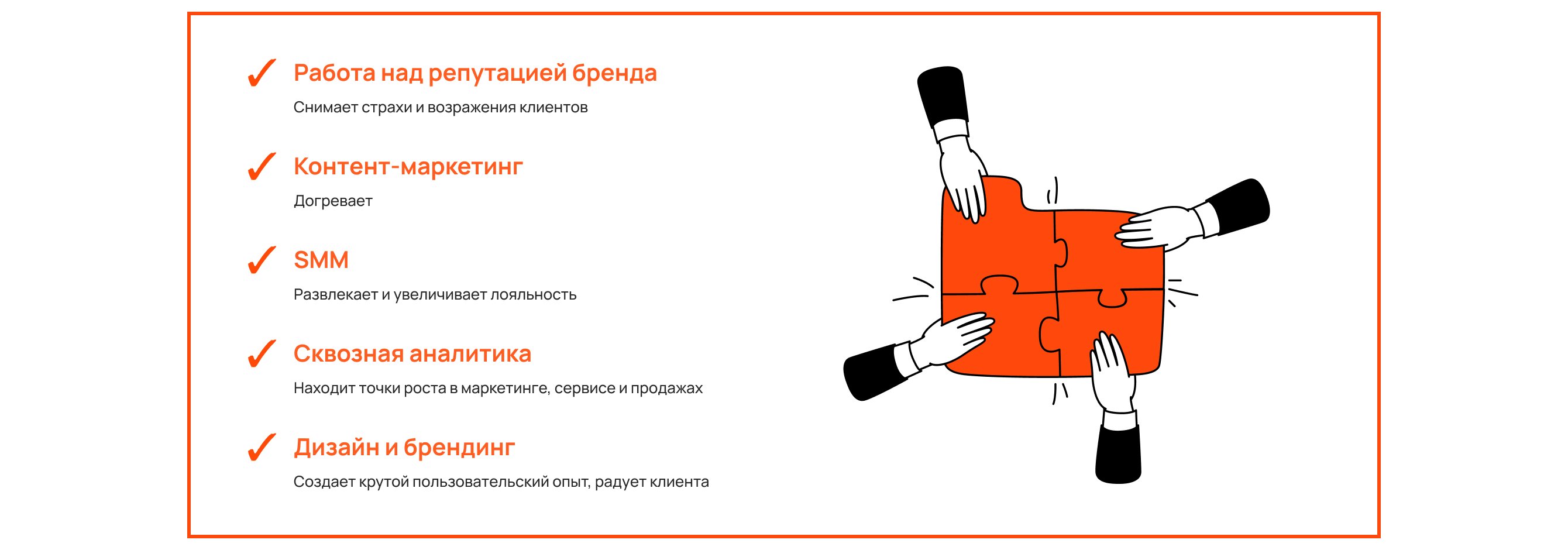 Мы предложили заказчику комплексный маркетинг — подход, при котором синхронно работают над несколькими каналами продвижения. Это нужно, чтобы охватить максимум ЦА и быстрее достичь бизнес-целей. Условно: на одной контекстной рекламе и соцсетях мы доплетемся из точки А в точку Б в один срок, а с синергией каналов — в 1,5 раза быстрее.