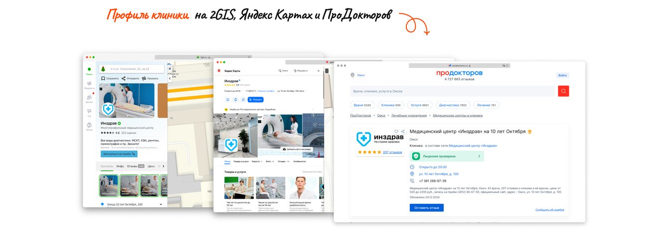 Работает так: мы оформили профили на популярных онлайн-картах и подключили внутреннюю платную рекламу и геомаркетинг: когда пользователь ищет медицинские услуги на карте, ему подсвечивается клиника. Например, пациент ищет лор-врача в 2GIS и видит Инздрав первым в списке.