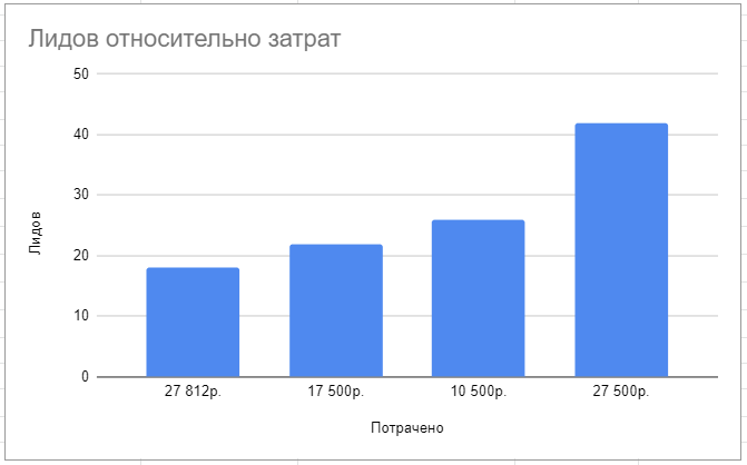 На графике со столбцами видно, что по мере роста канала снижается и стоимость 1 лида. Так, в первый месяц работы над каналом, стоимость лида составила 1545 руб., а к 4 месяцу это было уже 437 руб.