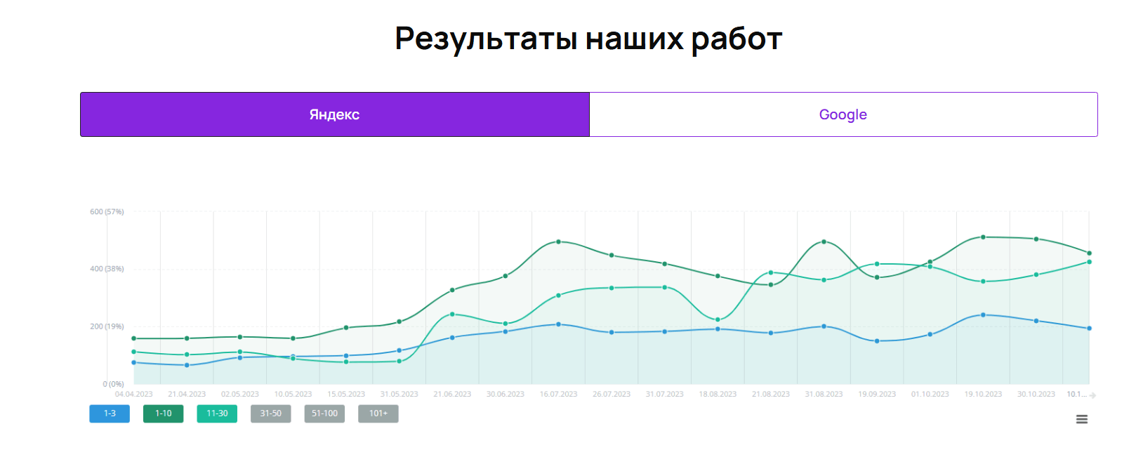 Благодаря этой стратегии мы смогли добиться определенных результатов в поисковой выдаче, ниже можете ознакомиться с динамикой сайта в поисковой выдаче Яндекс и Google с 04.04.2023 по 10.11.2023 (в 2023 году семантика была пересобрана и создан новый проект в системе отслеживания Topvisor, проект в работе с 2020 года).