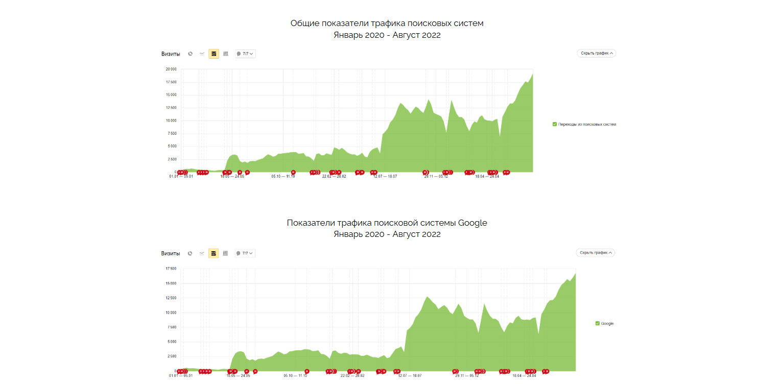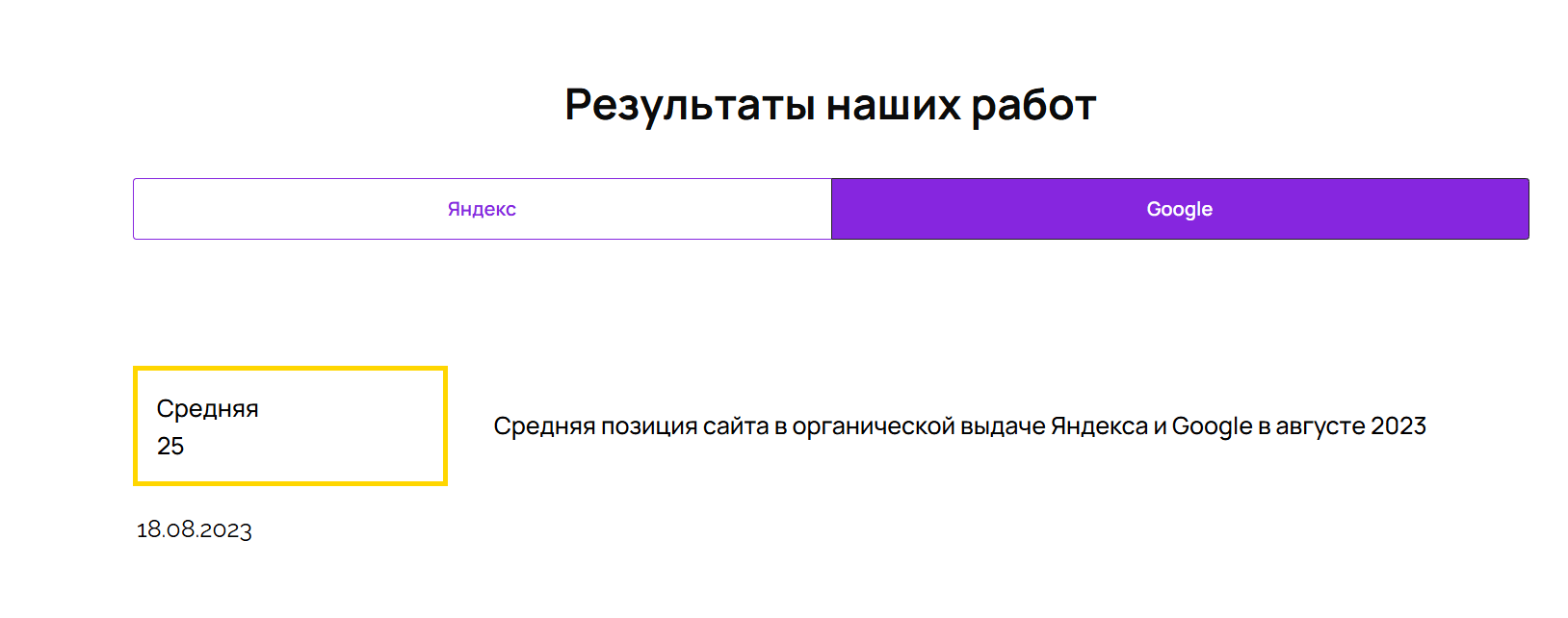 За это время мы показали рост по многим ключевым запросам, которые важны для клиента и смогли привлечь дополнительный трафик на сайт в поисковой выдаче Яндекс и Google.