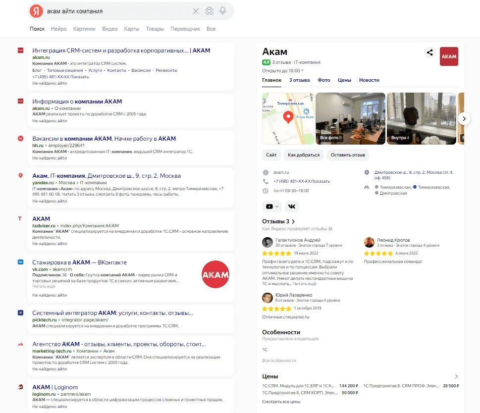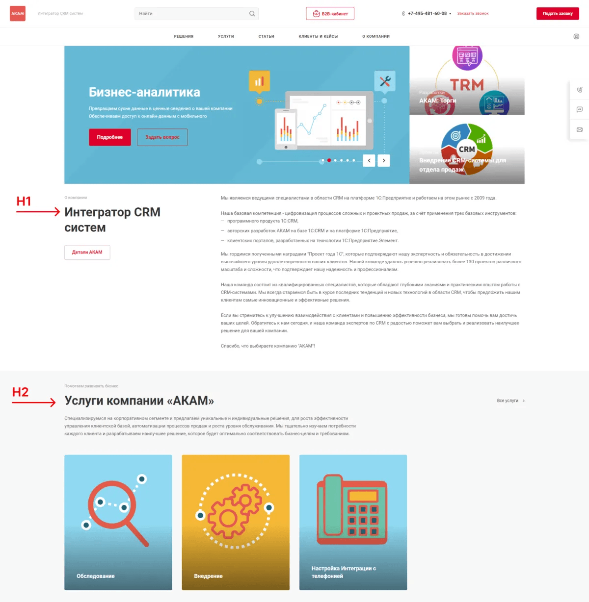 Получить видимость в поиске по запросам, связанным с обследованием, аудитом, внедрением и сопровождением 1С:CRM компании «Акам».
