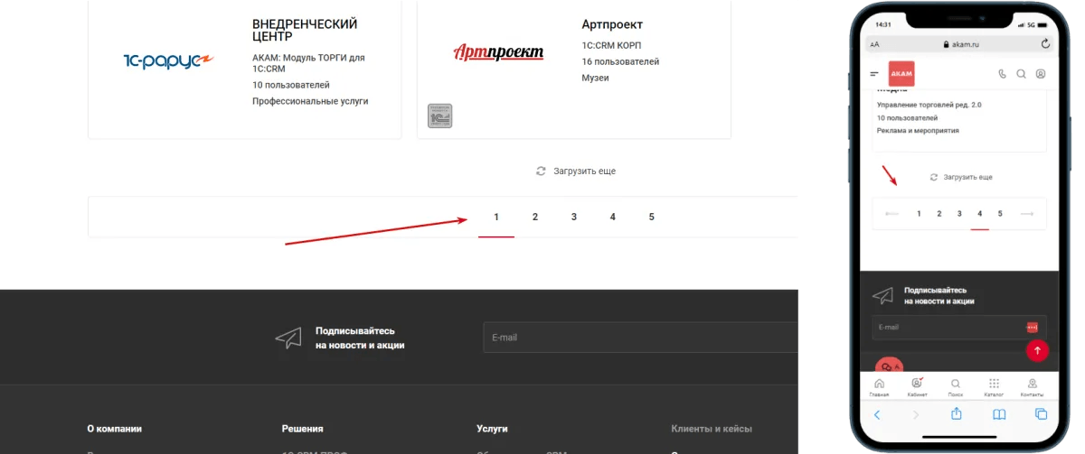 В разделе «Клиенты и кейсы» настроили удобную пагинацию, чтобы пользователям было проще переходить между страницами.