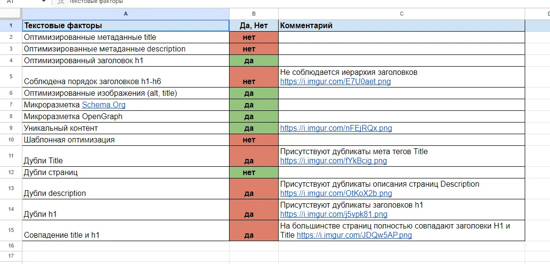 — Анализ коммерческих факторов сайта: например, наличие описания о компании, ссылки на каталог с главной страницы, цены в услугах, телефон в шапке и т.д.